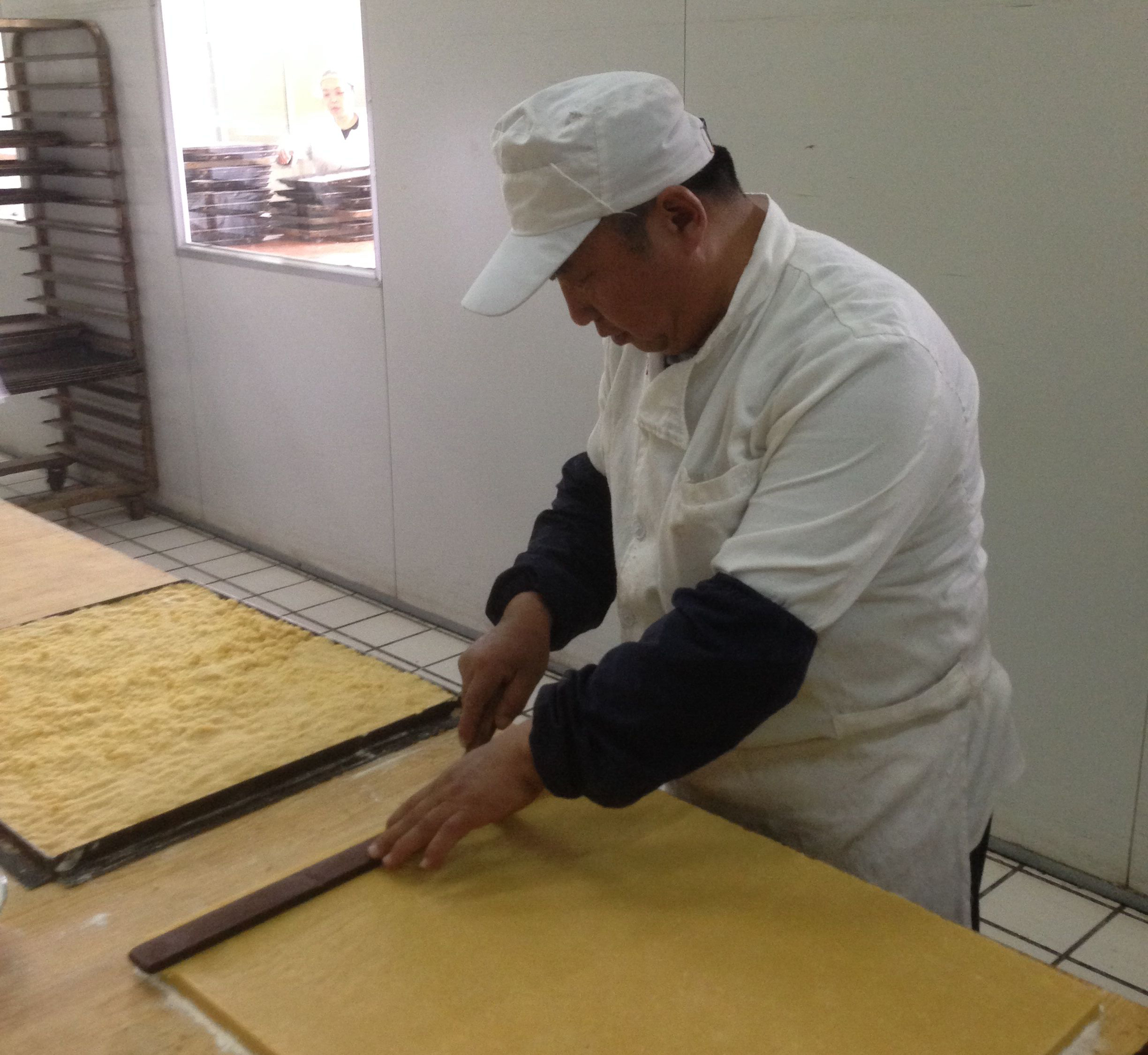 “蘇打餅干整個制作要花費6個多小時,其中醒面就占了將近4個多小時。這是一種清酥面的搟法,面皮和完以后裹上油之后再搟,所以要求面必須醒到位。另外需要注意的就是搟面的手法。搟制的過程中,面皮擱到桌面上要能清晰地看到面皮上的紋路,而且要均勻。”賈少春說起“蘇打餅干”的制作工藝如數家珍。